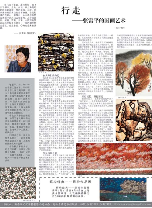 作为一个女性画家,张雷平很珍惜每次出行的机会,因为时间对于女性太重要了。祖国西部是那样神秘而又辽阔,它深深吸引着女画家。无论是在世界屋脊-西藏高原上,还是走在一望无际的戈壁滩,或在千年古城废墟前……她都显得特别激动和兴奋。因为那是在鲜活的大自然中,就像潘天寿曾说黄宾虹是“十里拜一师,行万里路,就拜了一千个老师”。张雷平也是一路拜师,把中国古老的国画笔墨和生动的大自然放在一起,一面吸取传统精华,一面扎入生活和大自然,努力走出一条国画新路来。她用苍劲厚实的笔墨,来表现西部山水显得游刃有余,加之作为女性对美的细腻感受以及坚实的西洋画基础,使画面色彩明亮厚重,从而创造出既有中国气派又具现代风格的作品,为国画的创新与突破做出了独特的贡献。目前,她仍然在继续探索着,在艺术的修行路上渐行渐远……