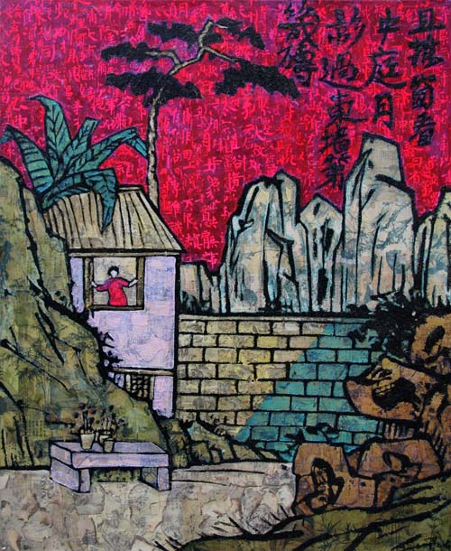 薛松是一位颇具个人特色的艺术家,在1990年年底一次偶然的火灾后,薛松从废墟中寻找到了属于自己的艺术语言和创作方法。他借鉴了西方利用现成物进行拼贴创作的概念,跳出了素材的限制,以烧制的方式来解构传统文化,以拼贴重置了流行的元素,使用文化符码来表现多层次的创作内涵。他以一种中国式的文化观点来呈现作品,不但使用山水画的构图,背景也是利用书法碎片拼贴而成,在他的作品中,我们还能看见西方文化的符号,虽显突兀却又是生活所见,其作品反应了东西方文化共融的混杂世代,如同混乱字体所象征的信息爆炸,以及西方消费文化的渗透。他的作品的独特定位同时也确立了其在艺术领域中的价值。